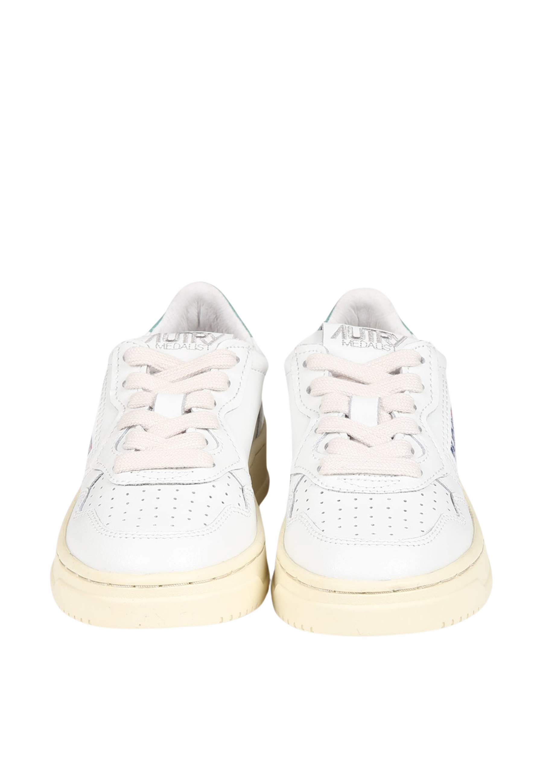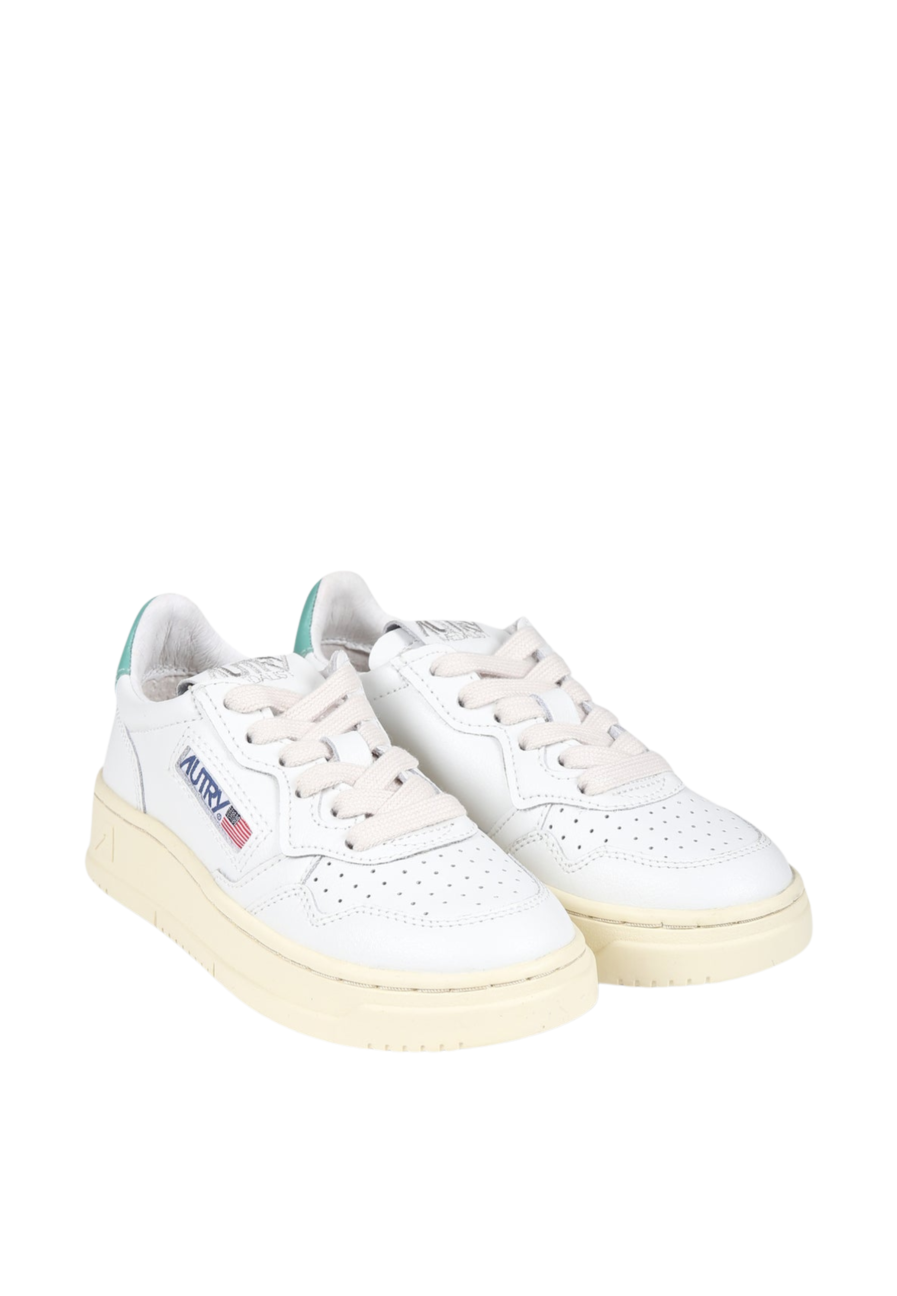 Sneakers bianche con suola oversize avorio, chiusura con lacci sulla parte superiore, punta tonda, fori traspiranti, caviglia imbottita. Sono decorate con logo blu laterale, logo grigio sulla parte superiore e logo verde acqua sul tallone.
