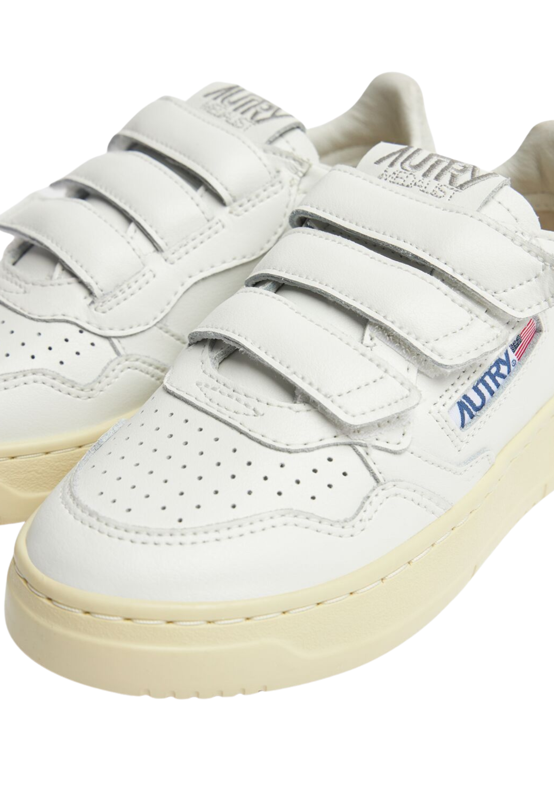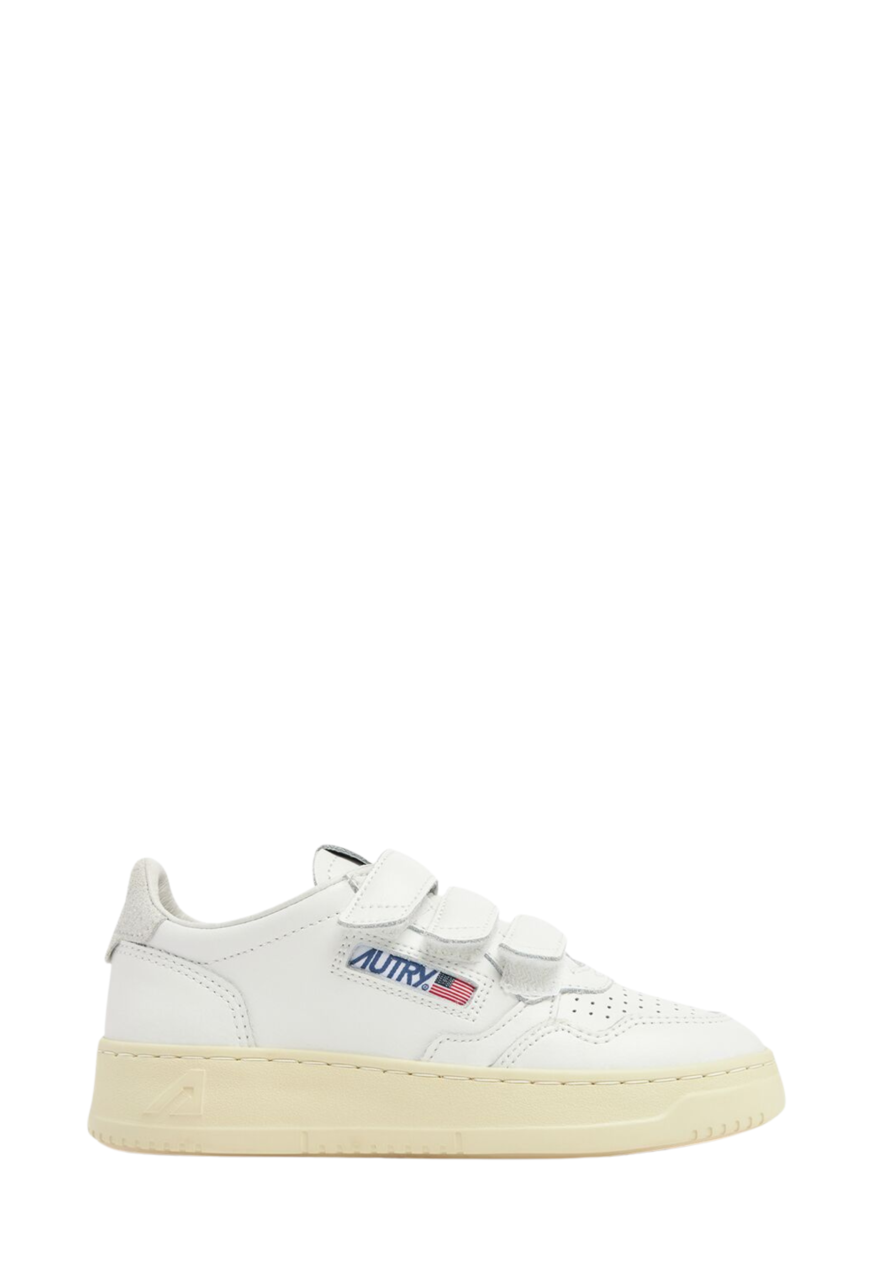 Realizzate in pelle tinta unita di colore bianco, hanno una pratica chiusura con fascette a strappo e poggiano su una comoda suola in gomma, distinguendosi per i dettagli autentici e logati tipici di Autry, da notare il talloncino in glitter argento.