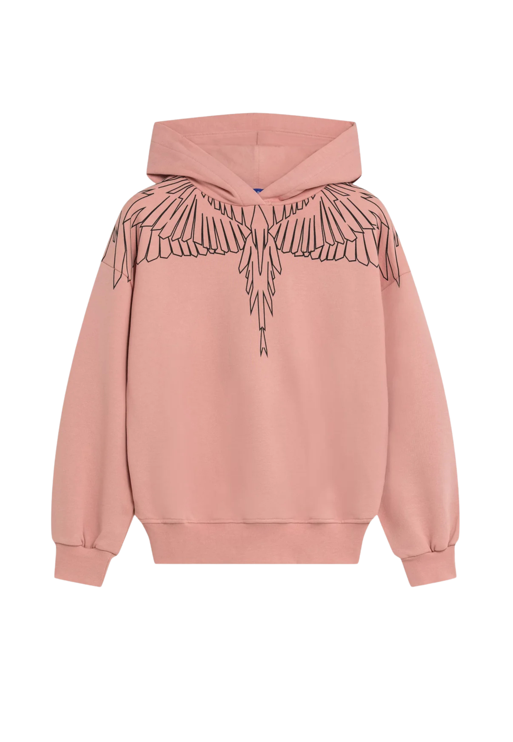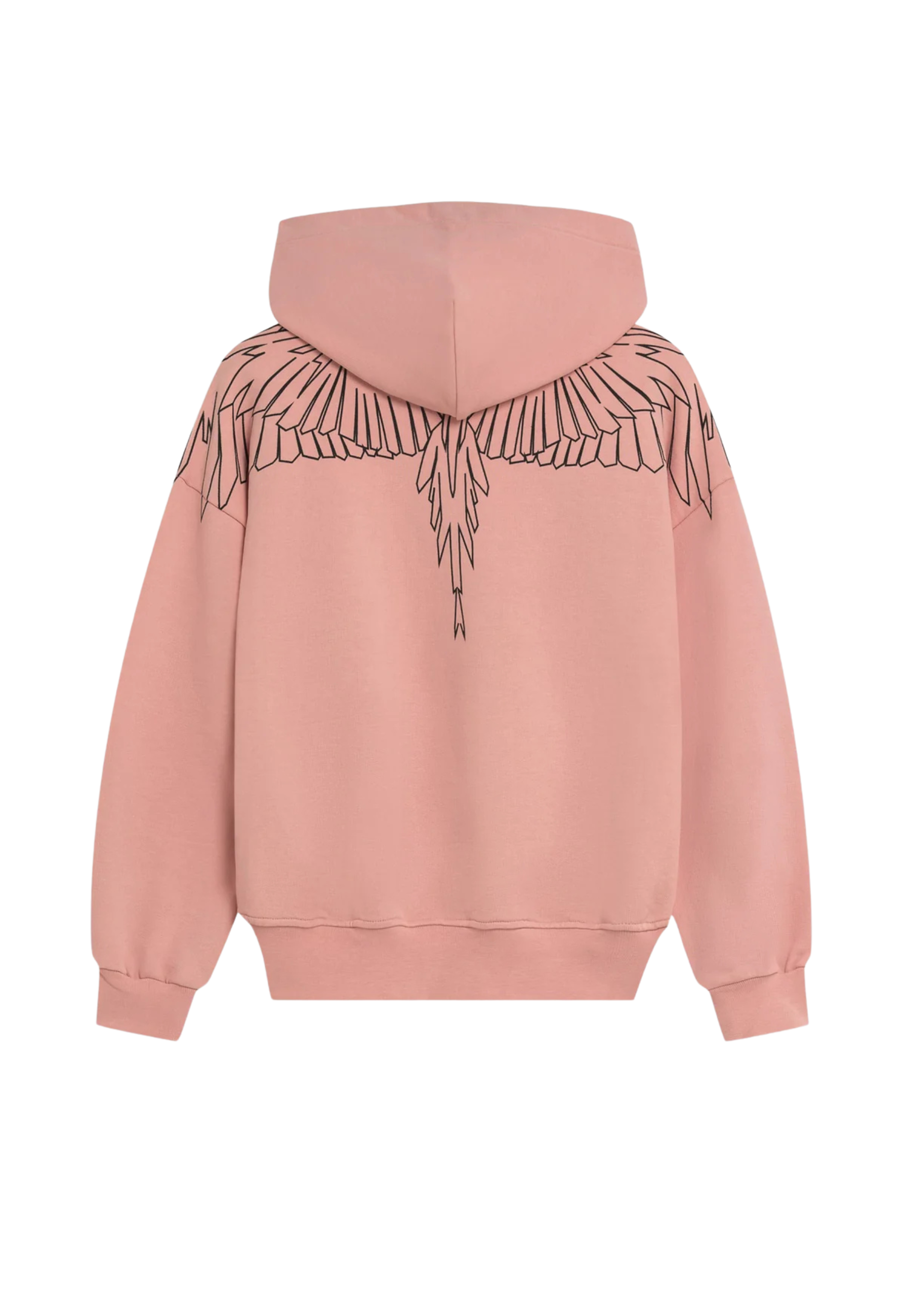 Felpa con cappuccio tinta unita con tasca a marsupio. Stampa continua di ali stilizzate geometriche sul fronte e sul retro. Polsini e fondo in costina