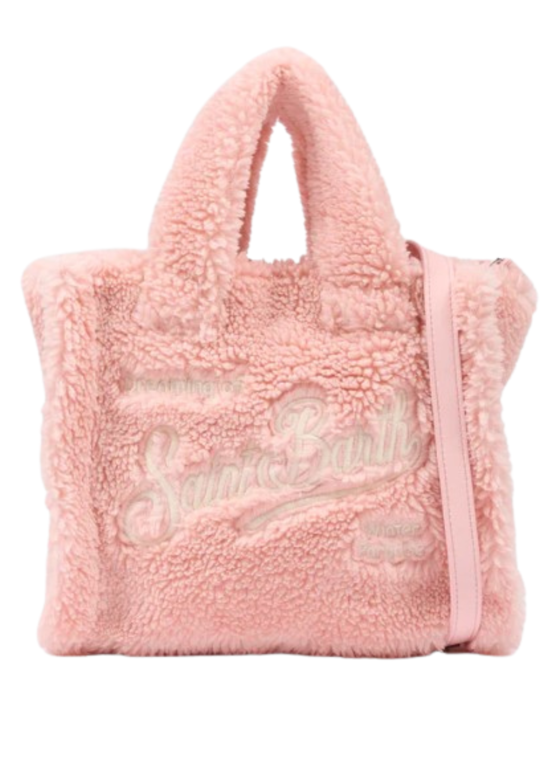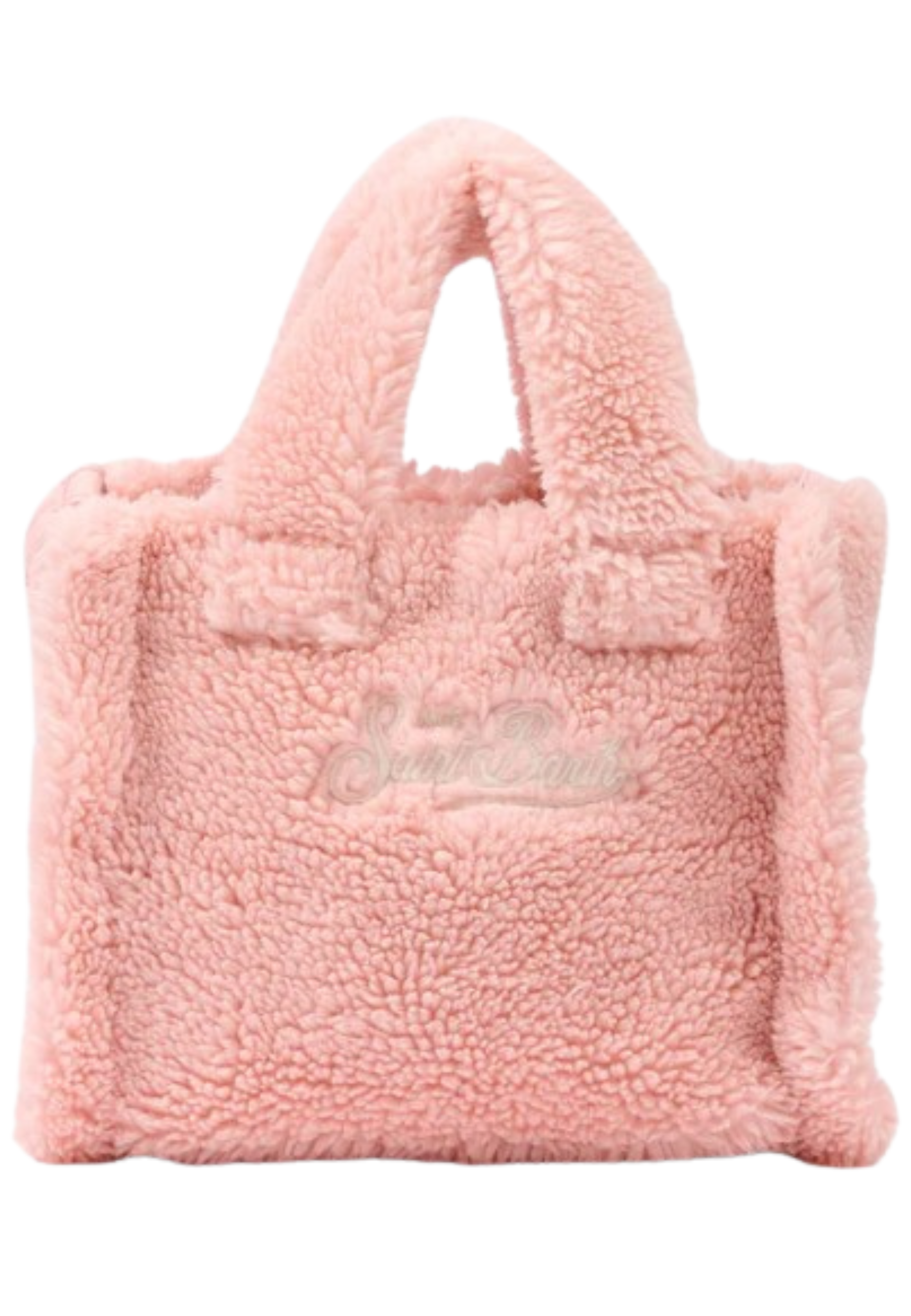 Borsa rosa in tessuto teddy, con manici, chiusura con bottone automatico e tracolla regolabile e removibile. È decorata con logo ricamato sulla parte anteriore e posteriore. Dimensioni (L x A x P): 23cm x20cm x13cm