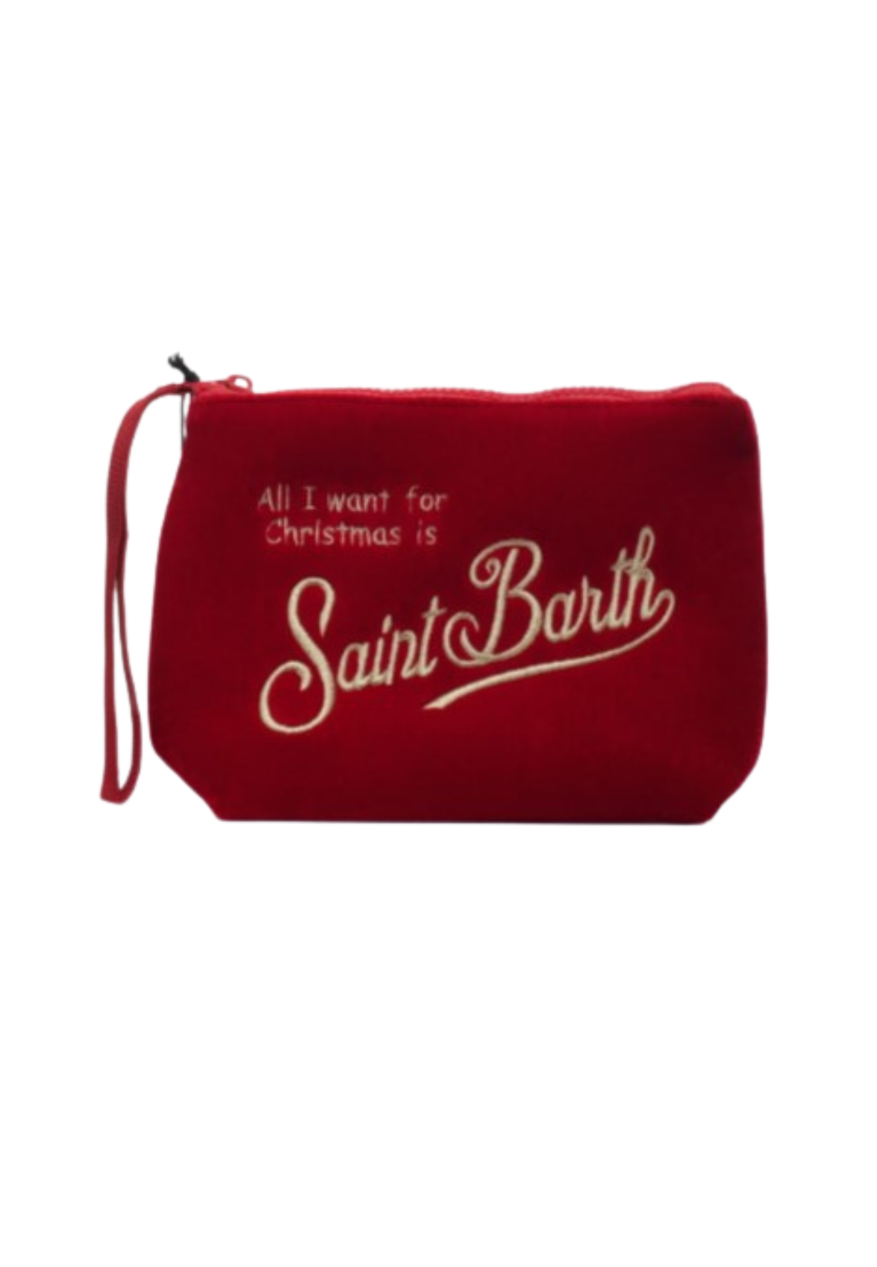 - Pochette in velluto rosso con scritta dorata ?All I want for Christmas is Saint Barth? ricamata sul fronte