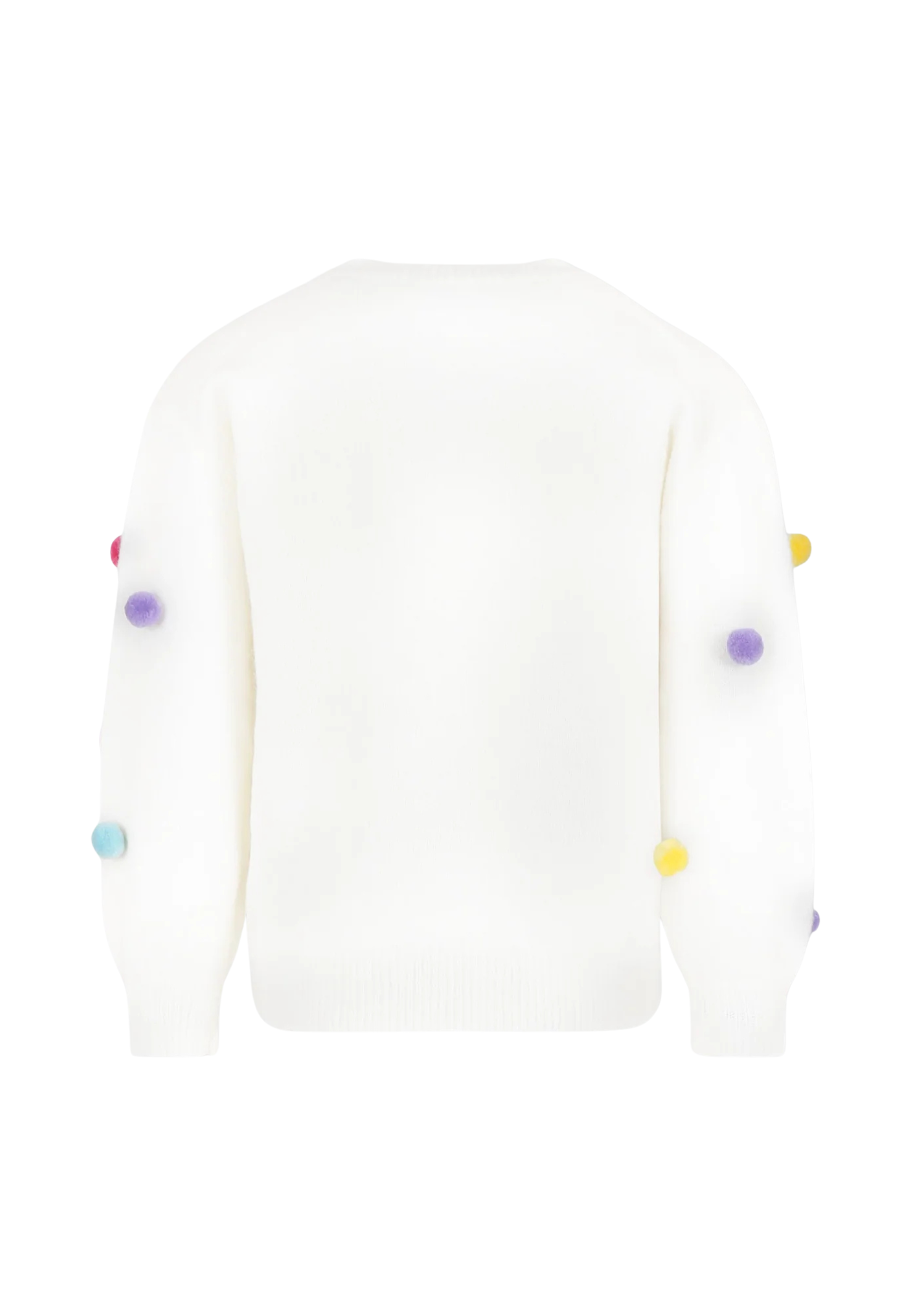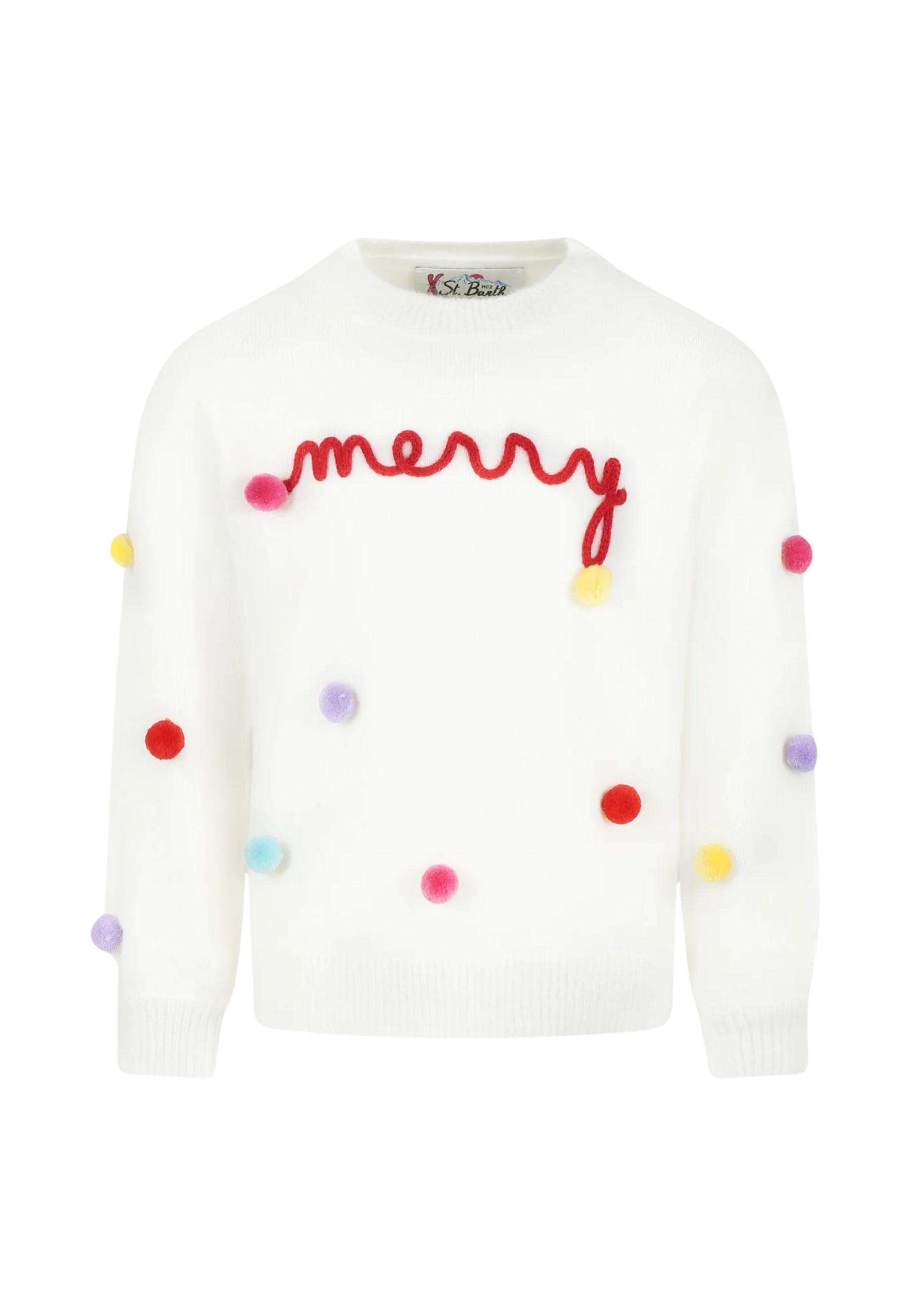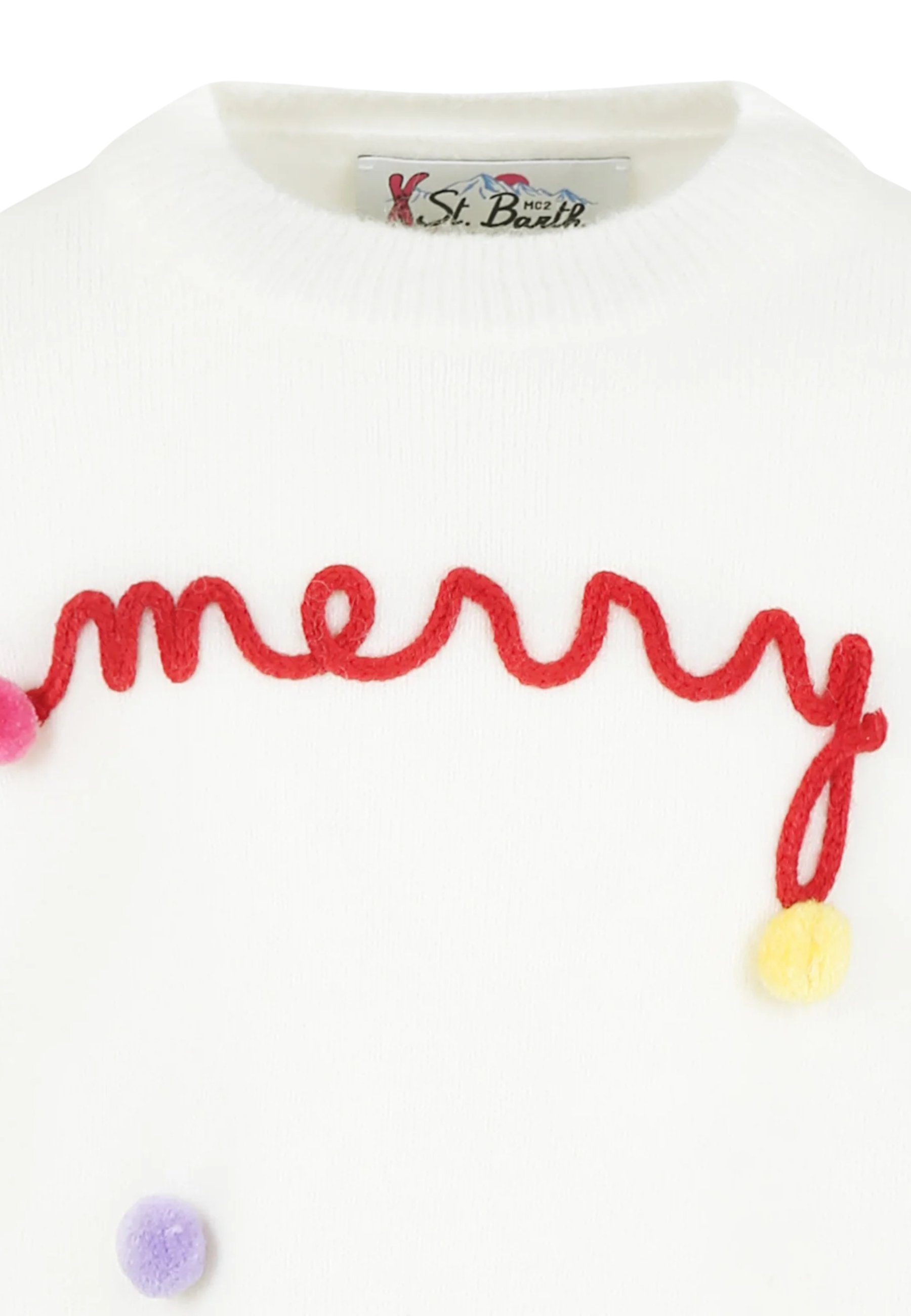 Maglia bianca Saint Barth in maglia grossa, decorata con la scritta merry in rilievo rosso e piccoli pompon colorati sparsi sul davanti. Stile festivo e giocoso, perfetta per il periodo natalizio.