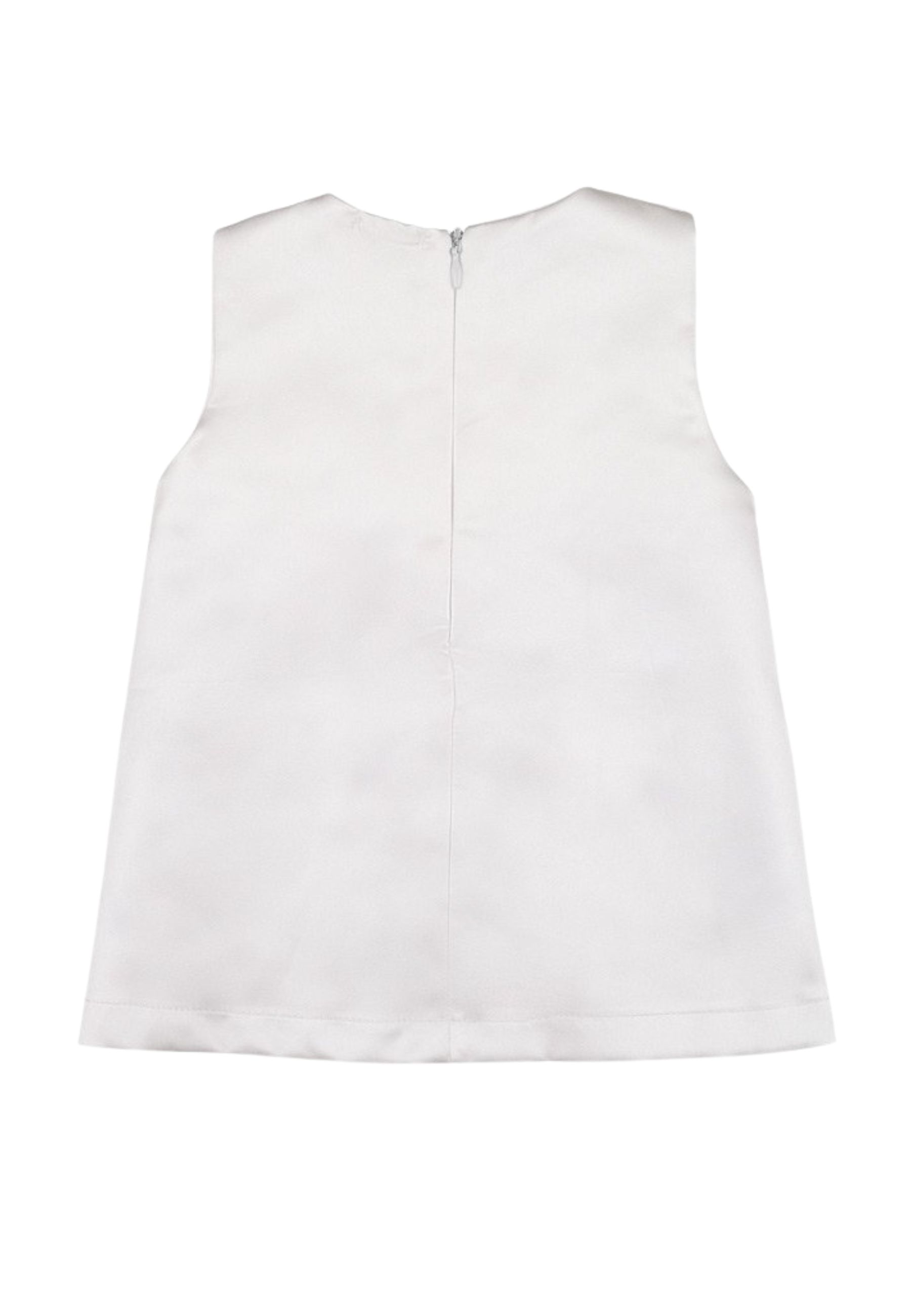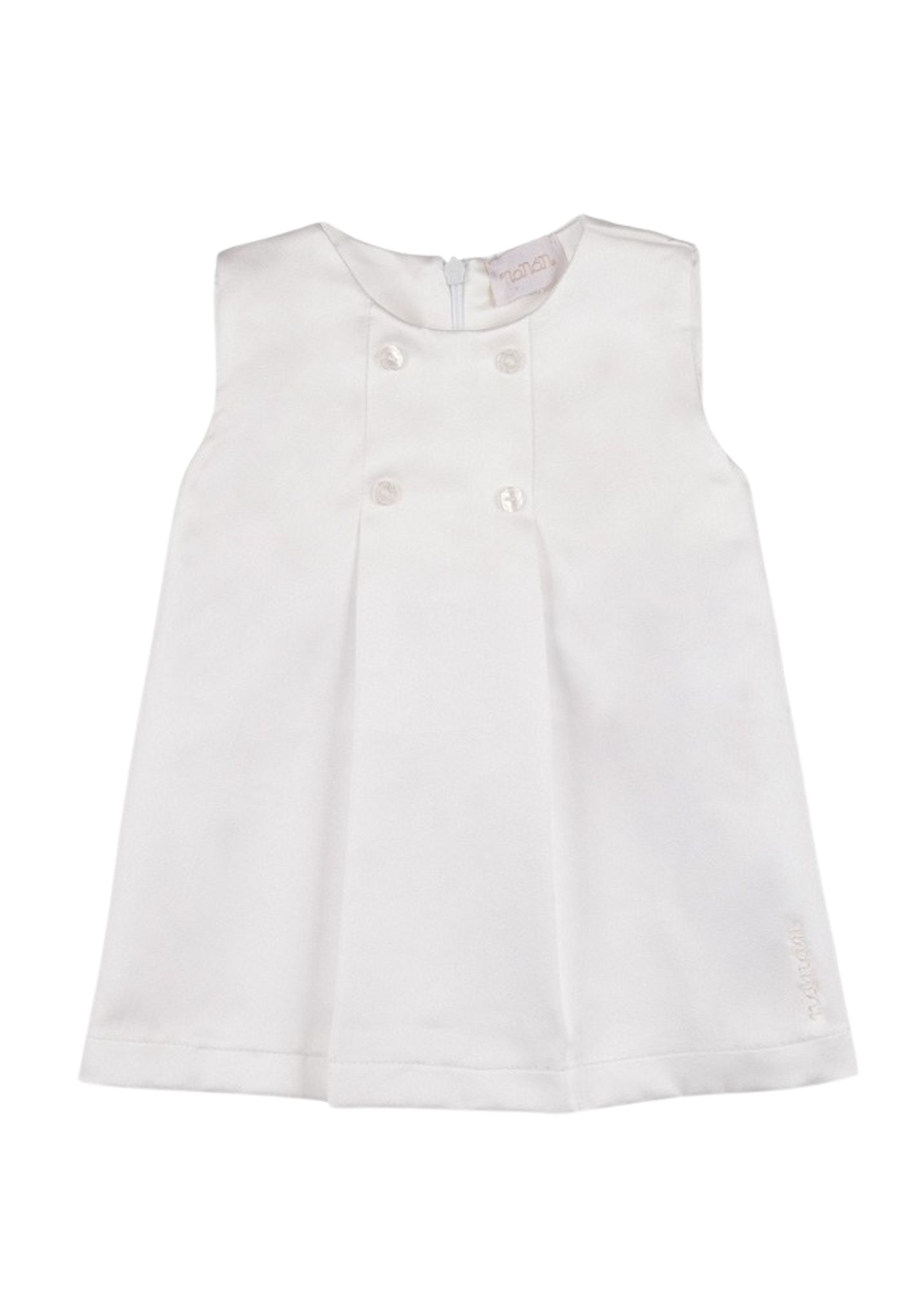 Elegante abito smanicato, impreziosito dalla presenza di quattro bottoncini e da una comodissima chiusura a zip in tono sul retro.