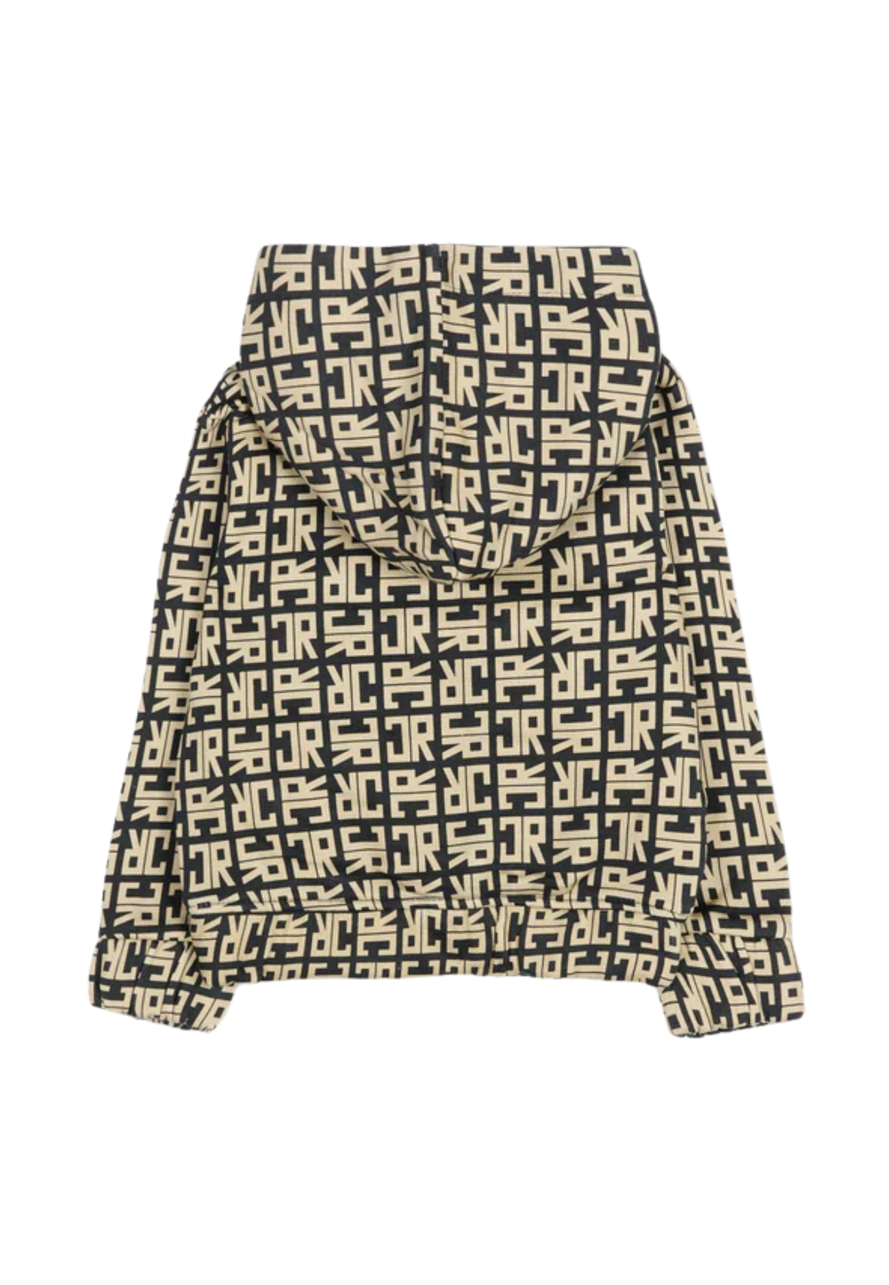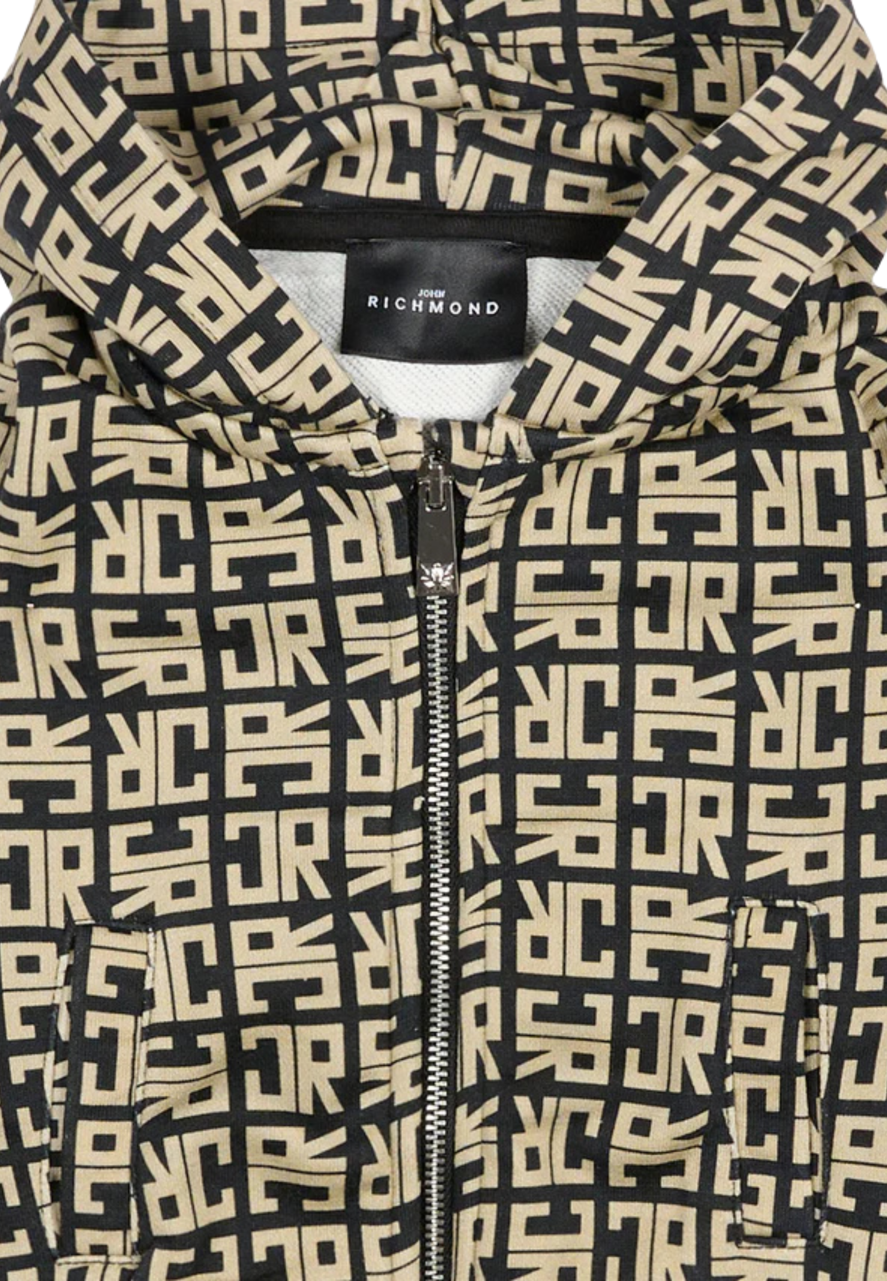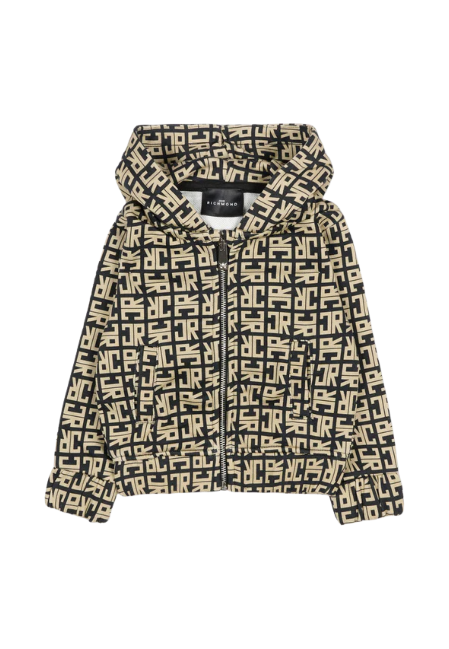 Felpa beige in misto cotone garzato, a maniche lunghe, con cappuccio, chiusura frontale con zip, tasche laterali, polsini e orlo elasticizzati. È decorata con stampa logo a contrasto all-over.