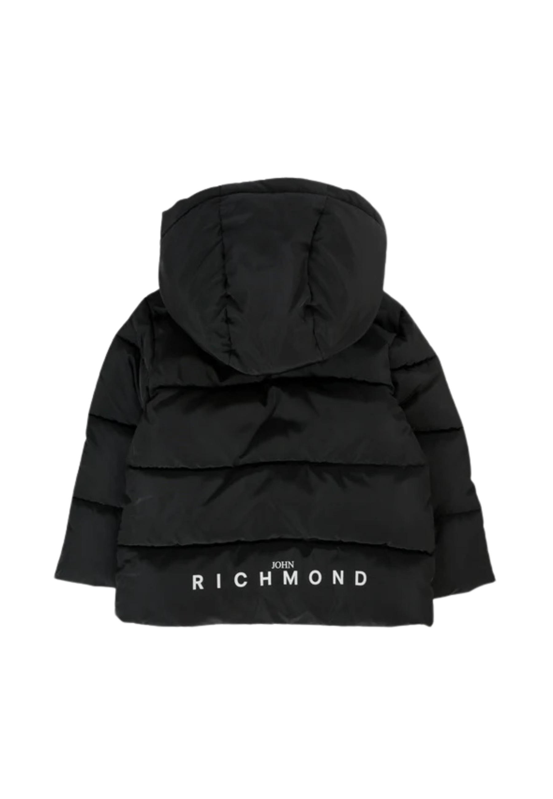 Piumino nero pesante, imbottito e trapuntato, a maniche lunghe, con cappuccio, chiusura frontale con zip e bottoni automatici e tasche laterali . È decorato con logo bianco, sul retro e sul petto.