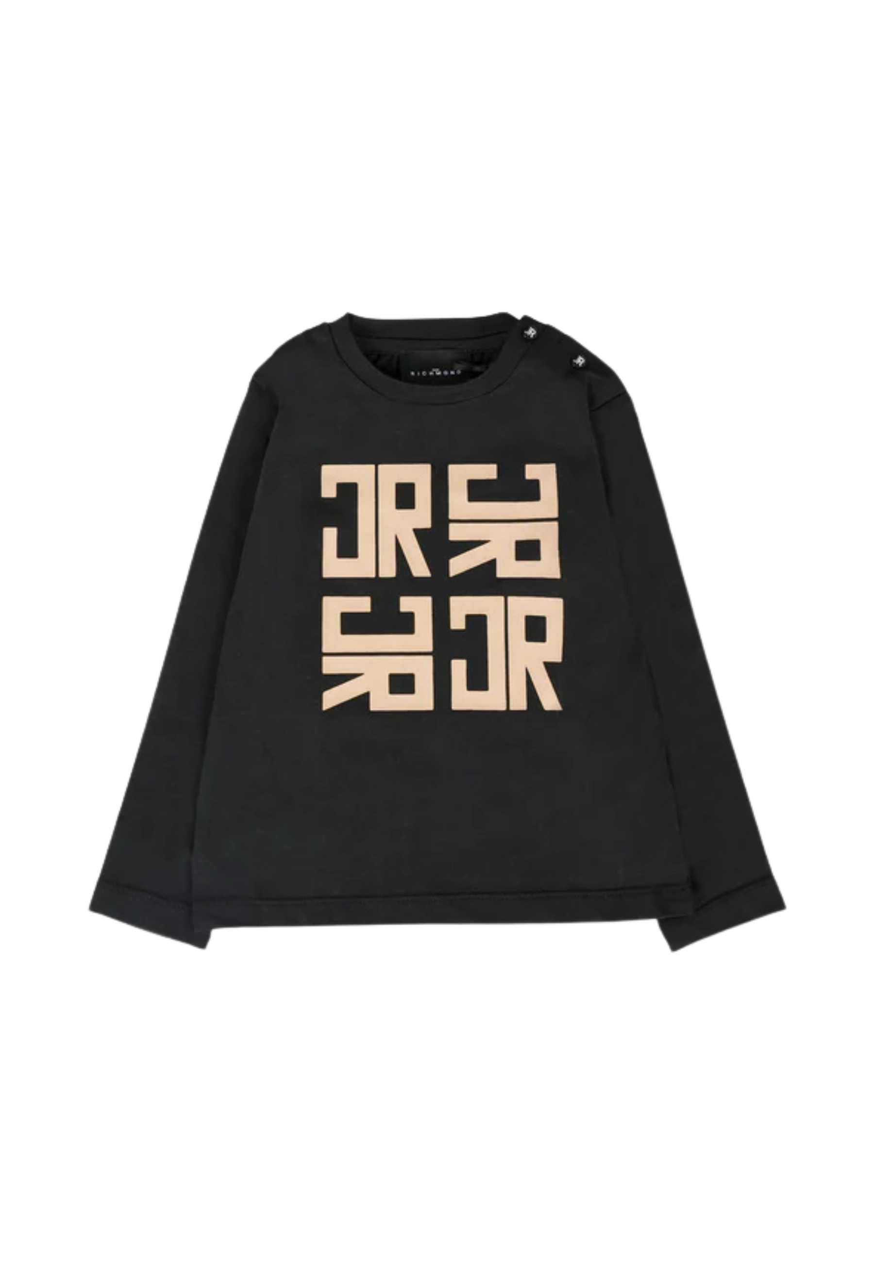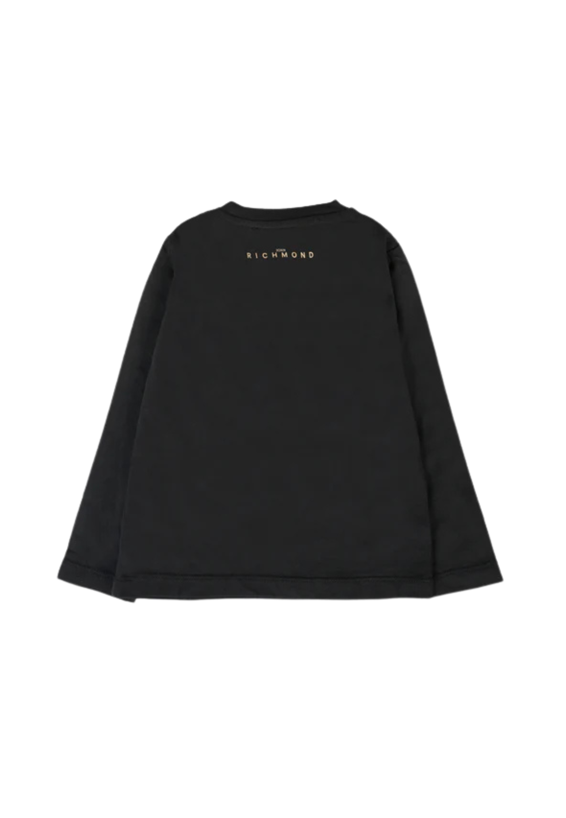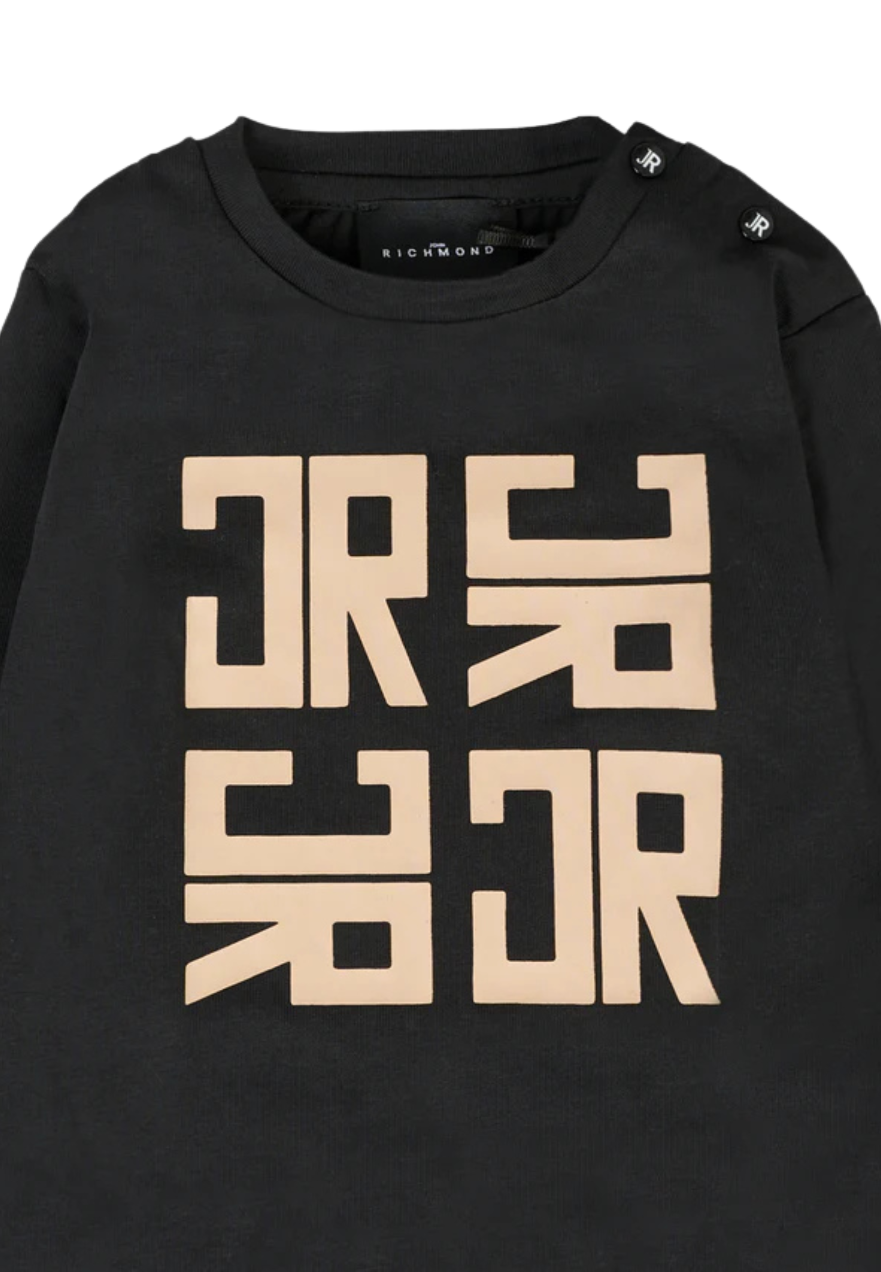 T-shirt nera in cotone organico, a maniche lunghe, con girocollo a costine e chiusura con bottoni automatici sulla spalla. È decorata con stampa logo beige sulla parte anteriore e posteriore.