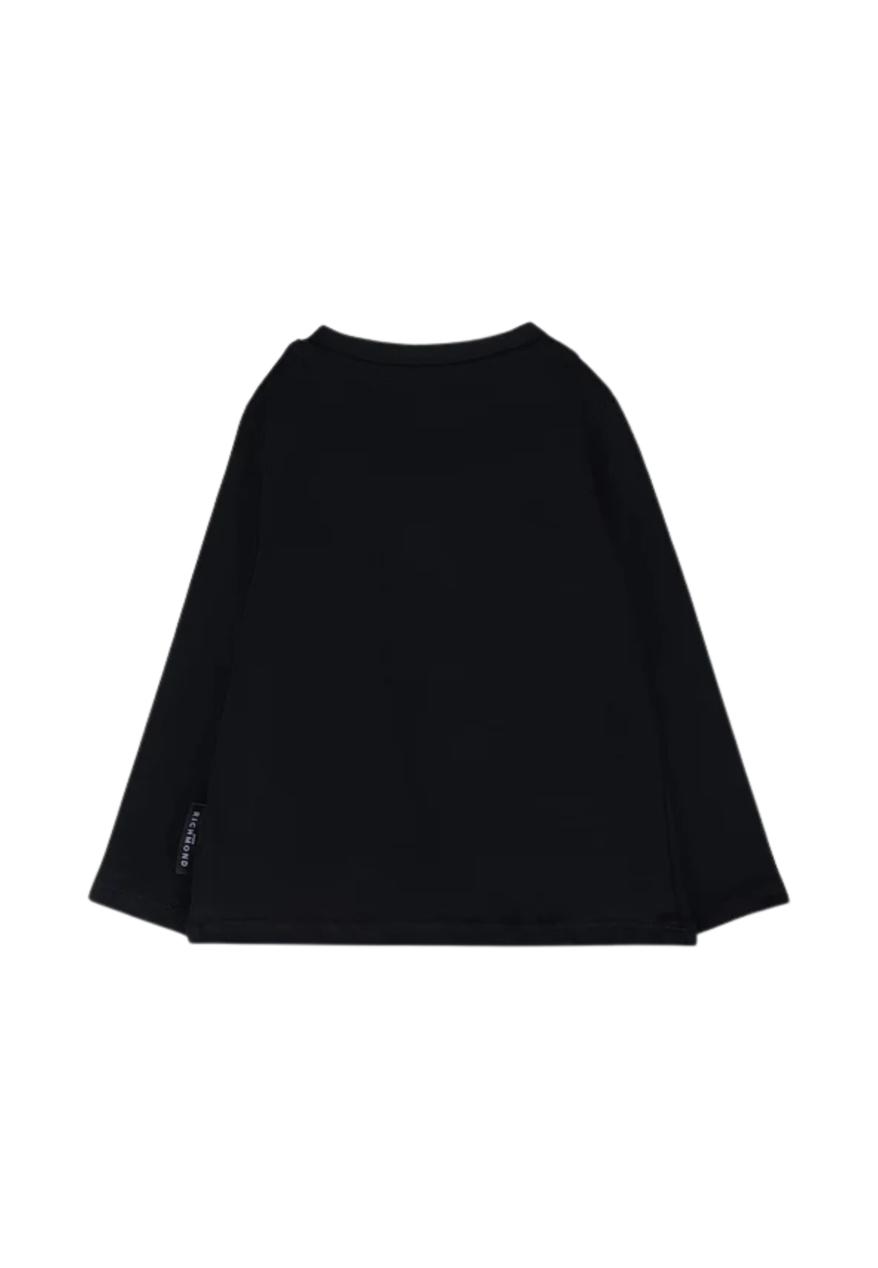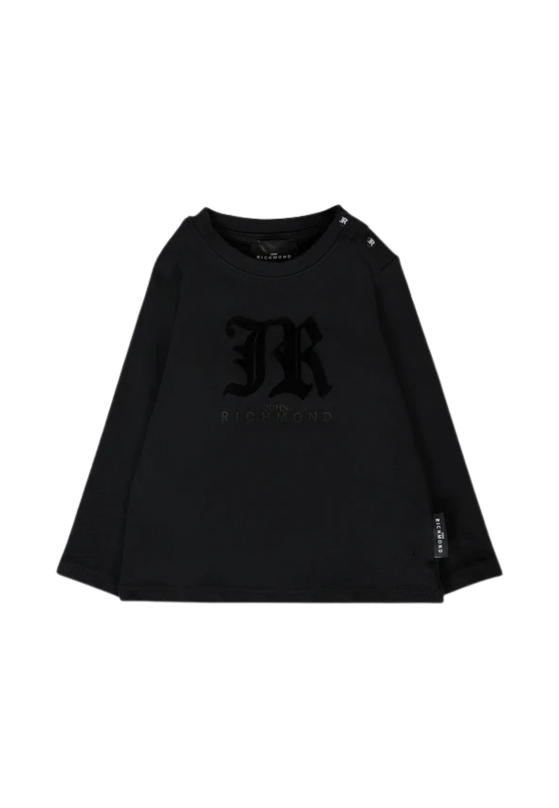 T-shirt nera realizzata in cotone, con maniche lunghe, girocollo e orlo a costine, chiusura con bottoni automatici sulla spalla. È decorata con logo in velluto sulla parte anteriore.