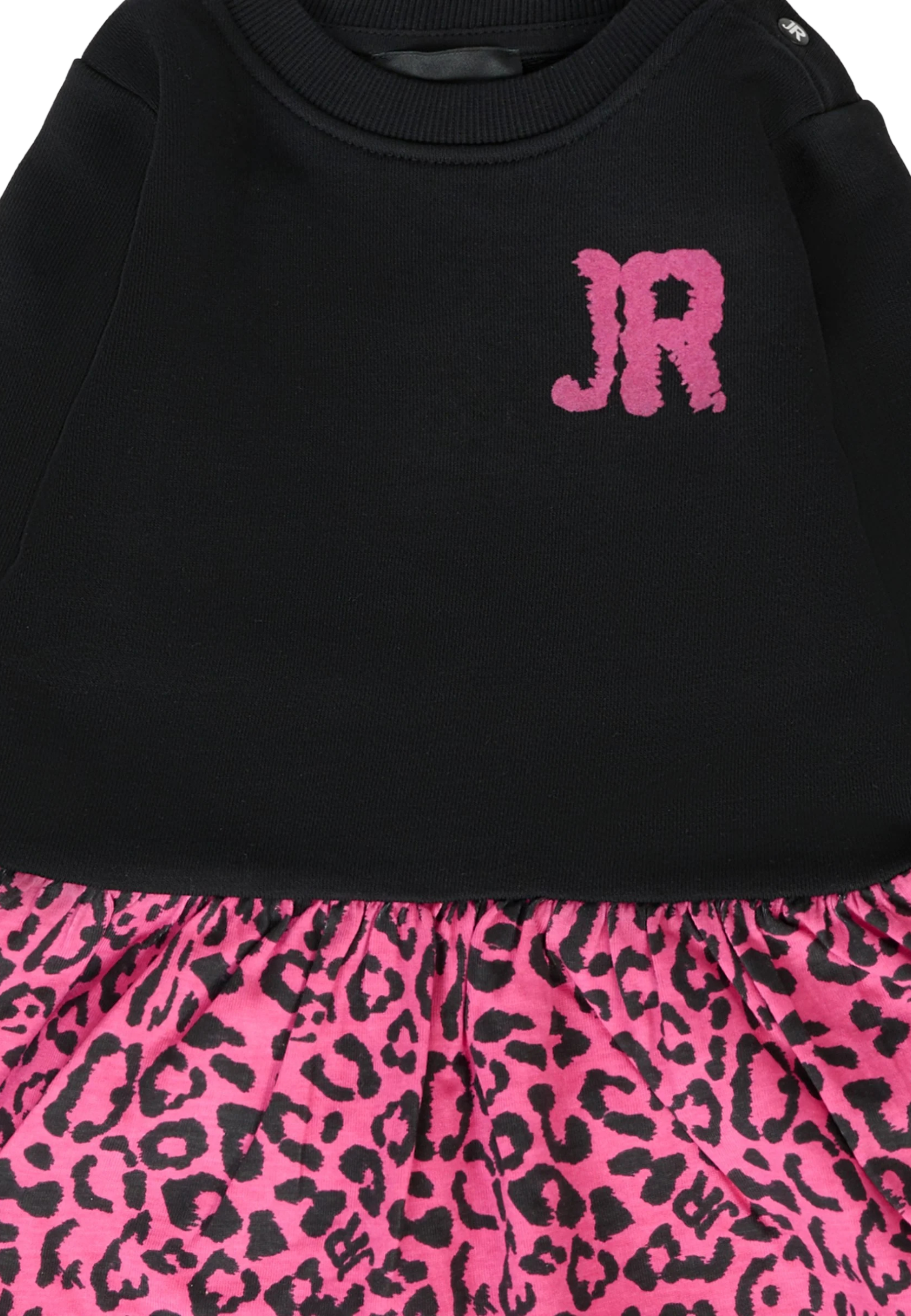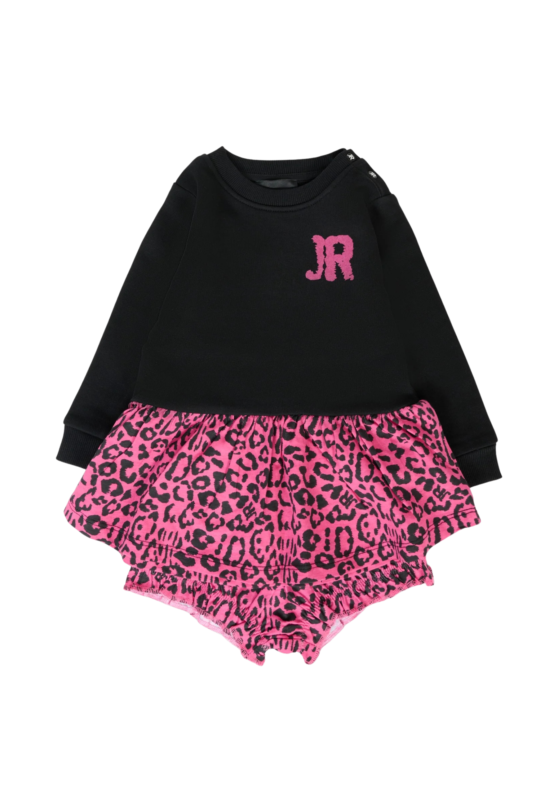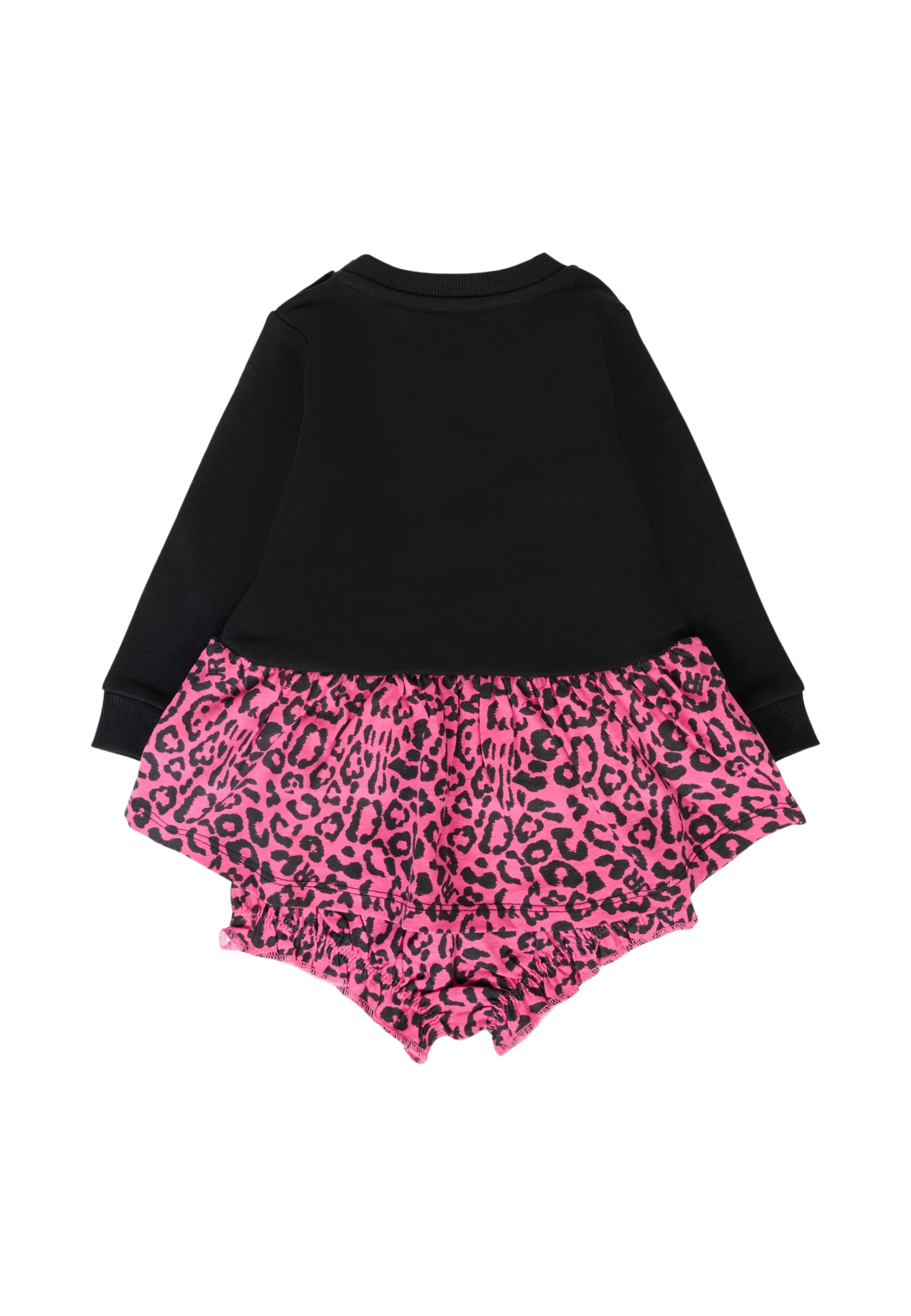 Vestito nero a maniche lunghe, con girocollo a costine, chiusura con bottoni automatici sulla spalla e balza fucsia a contrasto con stampa animalier; dotato di culotte coordinata con vita elasticizzata. È decorato con logo in velluto fucsia sul petto.